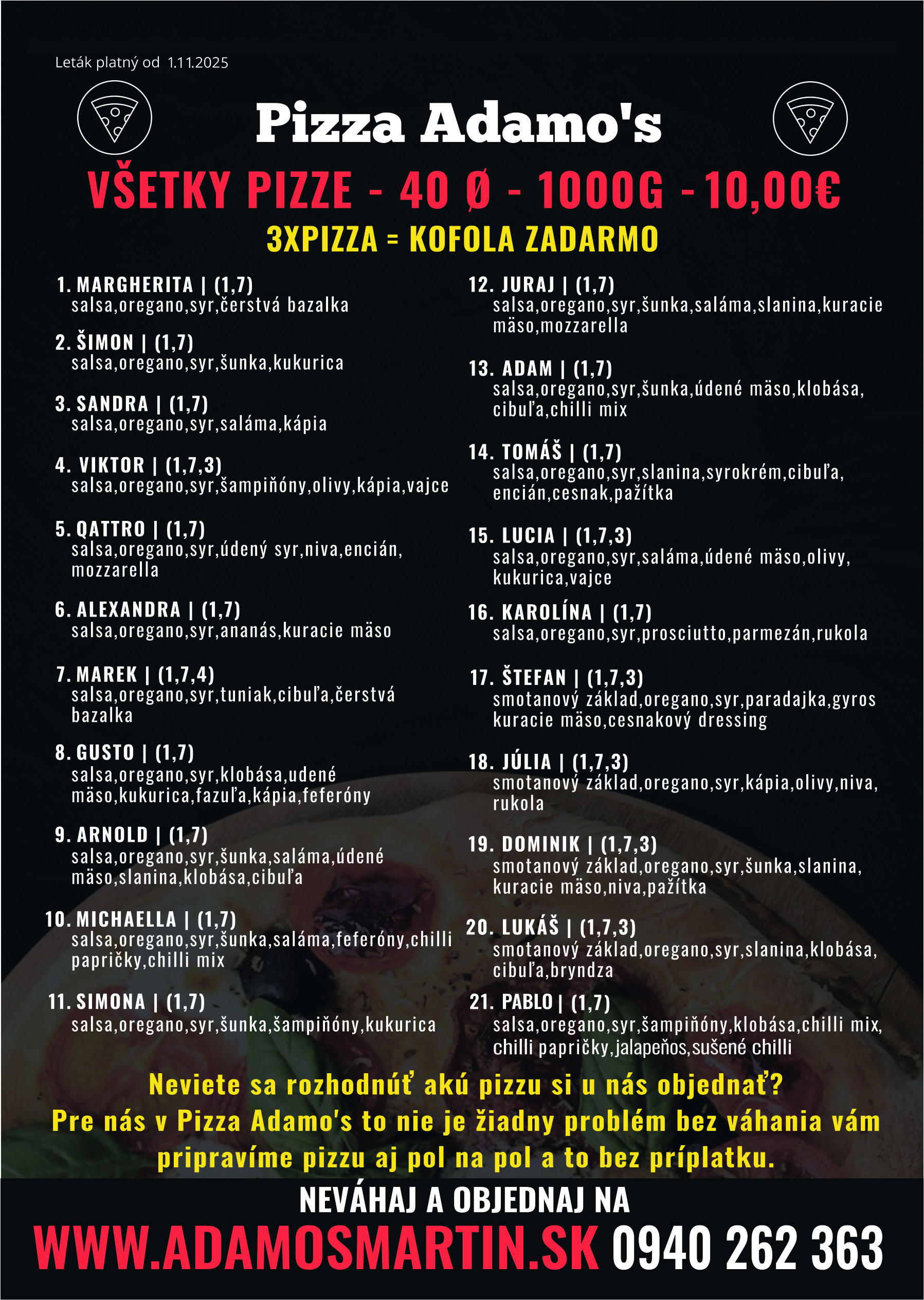 Sme partia mladých ľudí, máme radi svoju prácu, a robíme ju najlepšie ako sa dá. Sme pizzeria ktorá sa venuje výhradne rozvozu pizze vo vašom okolí. Nie sme reštaurácia a preto je každá objednávka bezodkladne spracovaná a doručená na vami zvolenú adresu. Naši šikovný kuchári sa starajú o každý krok prípravy, aby sme vám poskytli nezabudnuteľný chuťový zážitok. Stačí jednoducho objednať a my sa postaráme, aby ste si mohli vychutnať skvelú pizzu pohodlne v domácom prostredí. Ďakujeme vám za prejavenú dôveru a tešíme sa, že vám môžeme priniesť úžasnú pizzu Adamo's až k vám domov. Vaša spokojnosť je pre nás to najdôležitejšie.